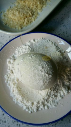 水煮蛋去壳表面沾裹低粉,再用拌好的肉馅完全包裹住,大致整理成椭圆形(可以借助保鲜膜定型)
