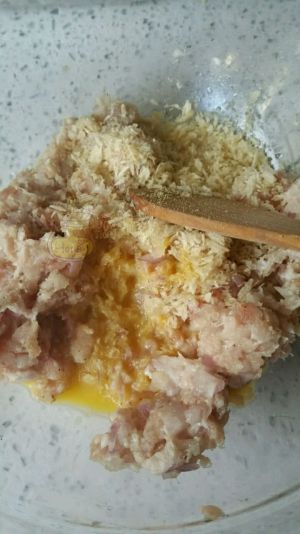绞肉加洋葱末、姜粉、盐、胡椒、1/2全蛋液、面包糠15g,搅拌均匀上筋