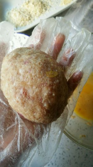 在肉馅表面依次沾裹低粉,剩余全蛋液,剩余面包糠