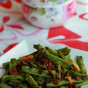 中火煸炒,看到四季豆起皱,翻面煸炒,两面都起皱,加入盐和少量的生抽体味,大火翻炒即可