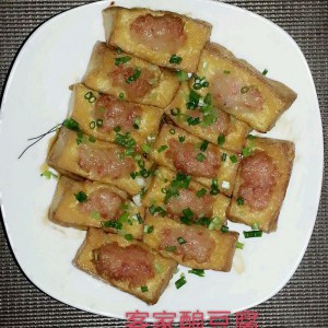 小豆腐块的刀切这面,挖适当的酿肉槽,酿入肉蓉。