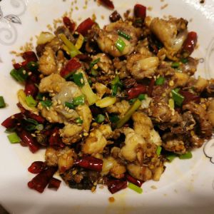 然后下鸡块 继续翻炒 撒盐和白芝麻 起锅 吃!天哪 好辣哦!(我这个干辣椒好辣)