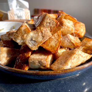 锅烧油,小火,我们家的炉具档位最高到15,我用了7左右,炸一会油温变高要适当放低,小火慢炸,微微上色捞出,放凉,复炸一次