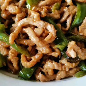 热锅倒油,加姜蒜炒香后,倒入肉丝,炒熟后加青椒翻炒,放入少许白糖调味