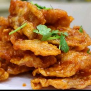 锅中留适量的底油烧热,加入提前调好糖醋汁,熬制粘稠,放入炸好的肉片,继续倒入葱、香菜、翻炒均匀。