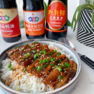 茄子盖在米饭上,再淋上一些蒲烧汁就好啦!