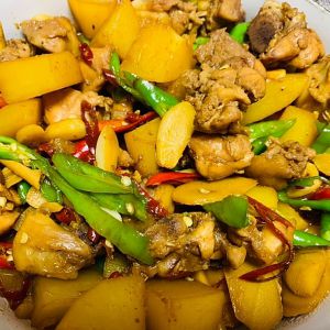2.鸡肉剁成小块 土豆切块 辣椒切段 蒜 姜切片