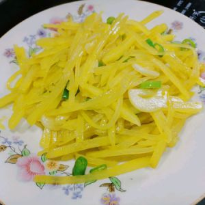 倒入土豆丝,中火翻炒。土豆丝微变色时加入醋、盐、鸡精。再翻炒片刻即可。(根据个人口味,土豆丝喜欢吃熟一点的可以翻炒久一些。