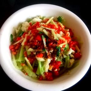小米辣切碎,大蒜切蒜米,姜切丝,葱花。