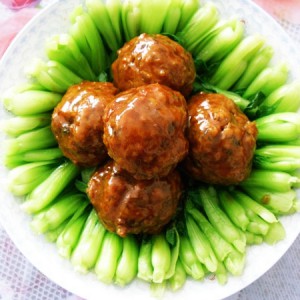 锅内留油,下入姜片、加入鸡汤、放入大肉丸子,放盐、味精、白糖、老抽王,用小火烧至汁浓,再用湿生粉勾芡收汁装入摆有菜心的盘子即克。