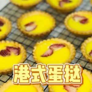 拿出冷藏的蛋挞液搅匀,倒入蛋挞模里,放入喜欢的水果,烤箱提前十分钟预热,上下火180度,烤20分钟左右,考完之后,晾到不烫手就可以脱模了,一点都不会粘模具哦!