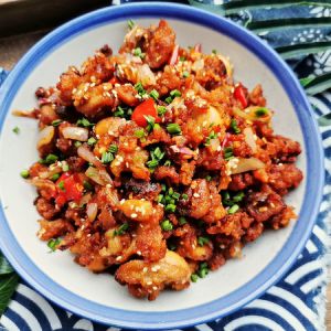 8.最后把炸制好的鸡肉倒入锅中均匀翻炒,起锅前撒入熟芝麻