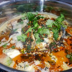1、爆蒜泥姜丝,(有泡野山椒的话,可以放一点。)然后放炒干的酸菜,炒香后,加入鱼汤。
