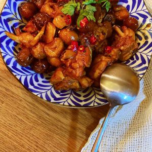 热油下锅炒鸡腿肉,上色可以放冰糖炒,然后放葱姜蒜酱油炒香