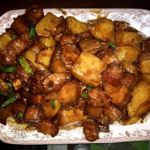 把五花肉出油,当姜丝、茴香、八角进去炸,30秒左右放进红糖一起炒,倒一碗水进去煮大概二十分钟左右放土豆,酱油一起闷直至出油