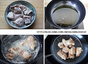 在腌制好的排骨撒适量淀粉抓拌均匀,锅里油烧至六成热,将排骨下锅,中小火满满炸透,捞出后沥油;