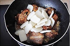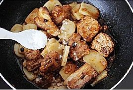 大火烧开转小火炖至排骨酥烂,将年糕加入;