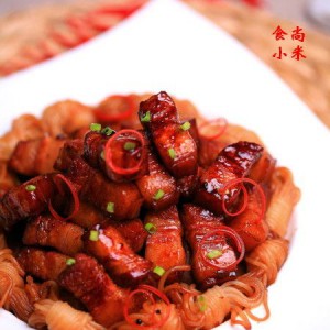 待红烧肉快熟时放入魔芋丝,加少许盐、糖调味,大火收汁,出锅装盘即可,撒红椒丝、香葱末点缀。
