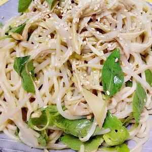 鸡肉煮熟,凉下,撕成条放入面条里,然后放入豆腐皮,豆芽,荆芥,调好的两碗酱料都适量,尝味道,不够再添加拌匀即可。