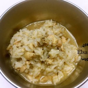 鸡肉丁,蘑菇碎,米饭一股脑儿下锅。略煮即可。