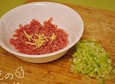牛肉丁里加料酒、生粉、少许盐、植物油和切细的姜丝抓匀腌制片刻;西芹梗切碎丁。