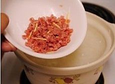 米粥熬至米粒开花后转成大火,烧滚后下入牛肉丁迅速搅散搅匀;