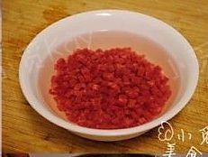 牛肉切细丁,放入冷水中泡20分钟,泡去血水后沥干水分。
