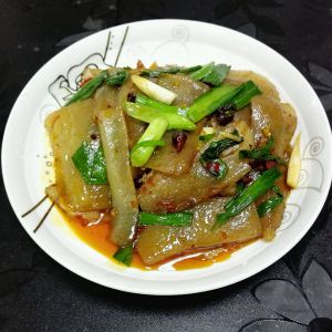 肉皮煮熟,捞起晾凉,斜刀片成片
