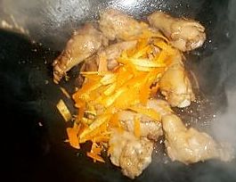 将切好的橙色子皮倒入翅根中,快速翻炒
