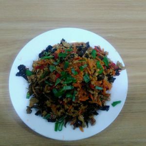 之后放入木耳和胡萝卜丝,翻炒几下后装盘,撒上葱花就可以出锅啦!