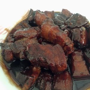 待肉略变焦黄后,加料酒和酱油,继续翻炒。