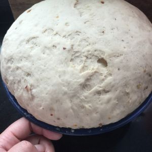 面粉买过来请面粉店的老板加的酵母,老板帮忙搅拌均匀了,回家用温水兑好红糖加到面粉进行揉面,要把红枣碎也加进去。揉成面团,放着醒面,这个要90分钟。。。第一次做没经验,装面团的盆子太小了,90分钟以后来看面已经醒好,已经要满出盆子
