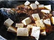 锅内加油烧热,用花椒,葱姜爆香,再放入干辣椒,添汤,汤要多放,因为后面还要煮粉条。放入鱼,料酒,盐,酱油,用小火炖十分钟。