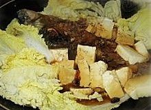 再加入宽粉,白菜,继续用小火炖十分钟。我今天用的宽粉比较薄,容易炖烂,如果用粉条的话就和豆腐一起下锅。最后将炖好的鱼连汤带菜盛到盆里,撒上香菜即可。