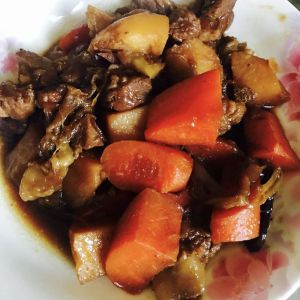 大概半小时左右放入土豆胡萝卜,在放入没过菜的水继续炖煮