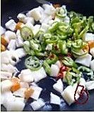 翻炒2分钟后,放入尖椒和小红辣椒,继续翻炒1分钟;