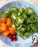 尖椒洗净、切丝,胡萝卜洗净、去皮、切丁,小红辣椒切小段;