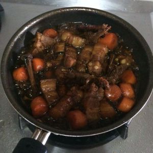 等上色均匀,倒入煮过肉的水,放少许生抽(以为前一天有吃剩的烧鸡,将鸡骨煮在汤里,更有几分鲜味)