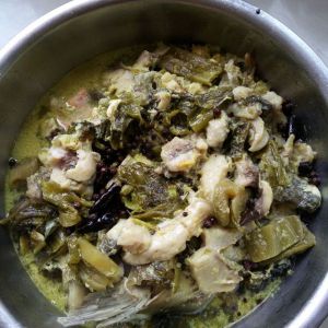 油热放两个小辣椒炒酸菜加开水,把鱼骨放入