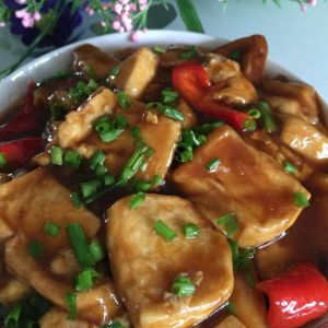留底油烧热倒入姜葱蒜青红椒炒香倒入豆腐快速翻炒后倒入兑好的芡汁继续轻轻翻炒加点盐调味,撒点葱花