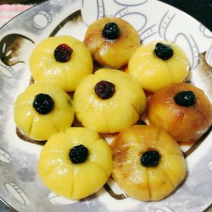 我试过包豆沙,失败了,就包了蔓越莓和蓝莓。按压在胡萝卜上。用刀划出南瓜的样子,蒸15分钟