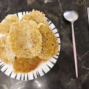 锅内放入油小火,南瓜泥放入面包糠滚两滚,放入锅内两边煎黄即可!