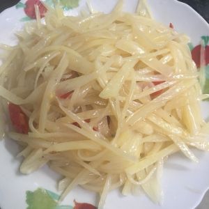 准备食材!土豆削皮切丝!土豆丝洗一次水,去掉表面淀粉!切蒜米(喜欢蒜蓉再切碎咯)切小红辣椒!
