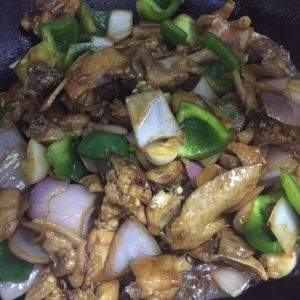 加入土鸡半只一起炒香,炒成5成熟
