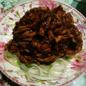 将泡过的葱丝铺在盘底,肉丝乘盘即可。香喷喷,色香味俱全啊!