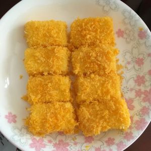 炸好后的样子,皮很酥脆,里面是软软甜甜的牛奶块,可以沾点果酱吃