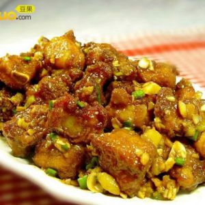 开温火热猪油(500克)锅,将排骨放入菱粉、蛋白糊里抓一抓,再放入油锅氽熟,然后将排骨取出,滤去油,盛在盘中。锅里的油也同时倒出。