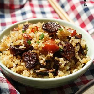 倒入腊肠和香菇翻炒出香味,加入胡萝卜,再加少许料酒。