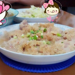 蒸熟后,取出作品,撒上葱花和香菜!我没有香菜只撒了葱花!蒸的时候水多了,盘里就有水了!建议蒸的时候水不要放太多!