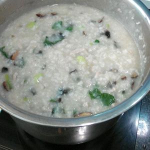 然后把腌好的肉倒入粥里有下往上搅下把肉淹没在饭里面。